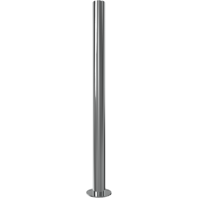 Hoogwaardige afzetpaal van gepolijst roestvrij staal met een moderne, vlakke afwerking. Geschikt voor zowel vaste plaatsing in de ondergrond als montage op een bodemplaat.