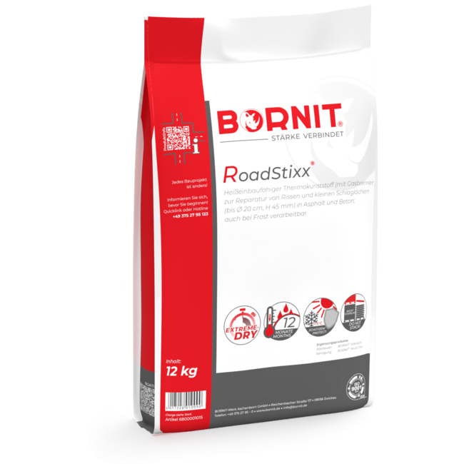 Deze revolutionaire thermoplastische Kunststof sticks zijn ideaal voor reparaties aan scheuren en oneffenheden tot ca. 0,5 cm diep. Geschikt voor reparaties op asfalt en beton. De RoadStixx vormen een perfecte hechting aan het oppervlak. Na ca. 20 minuten afkoelen kan de reparatie bereden worden. Er is alleen een gasbrander nodig om dit product aan te brengen. Bij grotere oppervlakten bevelen we het materiaal af te strooien met split 1/3. Het product dient droog en vorstvrij te worden opgeslagen. Niet in de volle zon of bij een warmtebron opslaan. De houdbaarheid is ca. 2 jaar. Het materiaal smelt zich vast in elke kleine hoek of oneffenheid. Door het verwarmen ontstaat een optimale hechting. Het materiaal kan het hele jaar door aangebracht worden.