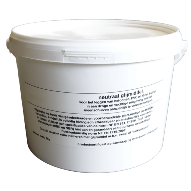 Bent u op zoek naar hoogwaardig glijmiddel voor PVC- en gresbuizen? Dit professionele glijmiddel van 5 kg zorgt voor een soepele en veilige verbinding van buizen, zonder beschadigingen. Ideaal voor loodgieters, installateurs en aannemers die een betrouwbare afdichting willen garanderen. Neutraal glijmiddel is een glijmiddel voor het monteren van buizen, moffen en fittingen. Verpakt in een handige emmer van 5 kg. Door deze handige emmer is de emmer makkelijk te bewaren na gebruik. Dit glijmiddel is toe te passen bij alle diameters van buizen en is geschikt voor pvc, beton en gres buizen. Tevens is het glijmiddel ook goed te verwerken op natte ondergronden.