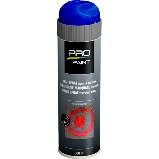 PRO-Paint Krijtspray blauw is een zeer goed zichtbare tijdelijke markeringsverf op kalkbasis. Zeer milieuvriendelijk. Daardoor zeer geschikt voor het markeren op tijdelijke evenementen zoals beurzen, sportevenementen, evenementen, concerten, calamiteiten
