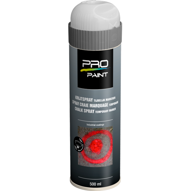 De Pro-paint tijdelijke markeringsverf in witte krijtspray is de perfecte oplossing voor tijdelijke markeringen. De spray is verkrijgbaar in opvallende fluorescerende kleuren en kan op verschillende oppervlakken worden aangebracht. De krijtspray verdwijnt geleidelijk binnen 5 tot 15 dagen afhankelijk van de laagdikte en de weersomstandigheden.