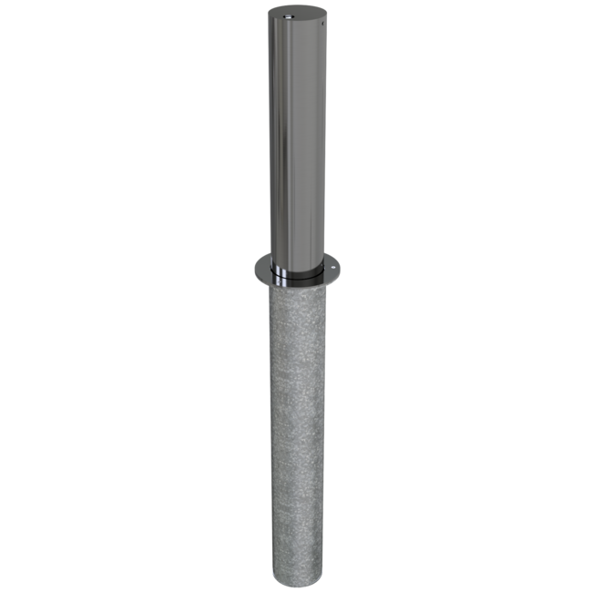 Semi-automatische neerlaatbare afzetpaal door middel van een geïmplementeerde gasveer. Vergrendelbaar met een driekantslot. Hoogwaardig RVS staal. Inclusief verzinkte grondhuls met een diameter van 168 mm.