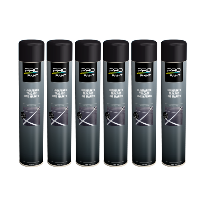 PRO-Paint Lijnmarker Zwart is de perfecte oplossing voor het snel en gemakkelijk aanbrengen van heldere, slijtvaste markeringen op verschillende ondergronden. De inhoud van deze doos is 6 spuitbussen van 750 ml in de kleur zwart, wat goed is voor ongeveer 75 meter aan lijnen. Deze markeringsverf hecht uitstekend op asfalt, beton, hout, straatwerk en steen, en is uitermate geschikt voor belijningen in fabriekshallen, magazijnen, parkeerplaatsen, sportvelden, vakantieparken en bij wegwerkzaamheden.