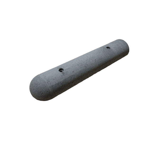 Robuuste grijze betonnen varkensrug met montagegaten. Eén kant is rond, de andere kant recht: ideaal voor parkeerplaatsen of terreinen waar je auto’s wilt afremmen én een nette afscheiding wil.