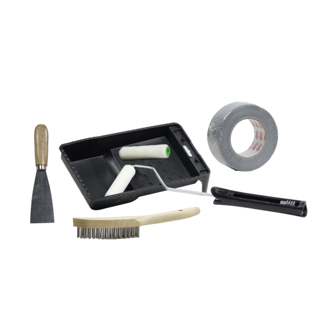 Compleet verf gereedschap pakket, ideaal voor het verven met wegenverf. Het pakket bevat een plamuurmes voor het verwijderen van verfresten, een rol Duct Tape voor afplakken, een verfbakje, twee lakrollers, een staalborstel, en een houder voor lakrollers.
